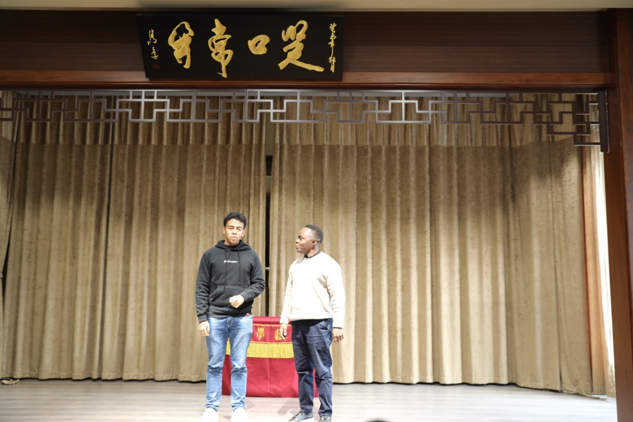马季艺术研究会艺术评论委员会副主任、天津曲艺团李梓庭,马季杯获奖选手杨皤、王子晨及师大两个外国职工按捺不住内心激动,走上舞台表演了相声小段,为英雄村庄喝彩,精彩的相声段子迎来阵阵掌声。