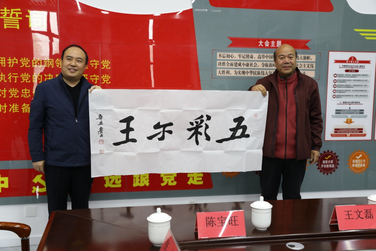 马季艺术研究会笑星书画委员会主任、天津美协副主席孟庆占欣然把一幅写有“五彩尔王”的书法作品献给尔王庄镇。实践团成员都纷纷表达对尔王庄的美好祝愿,表示要更加贴近农村、贴近群众、贴近生活,创作更好的相声优秀作品,来鼓舞人民,为新农村建设做贡献。