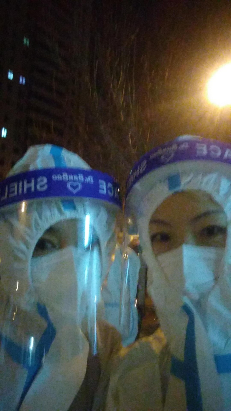 器乐表演系小号专业教师刘淼和键盘表演系钢琴艺术指导郭晶晶两位老师都在南开区水上公园街参加志愿服务,在不同的社区点位工作,前期承担了核酸检测引导、核实筛查情况等工作后,第三轮和第四轮全员核酸检测又承担了送检样本任务,这个环节更加考验志愿者的勇气、细致、精心和速度,和样本近距离接触,姐妹花不仅没有畏惧,反而是更高效地完成任务。两位老师在舞台上的合作并不多,但是在战疫一线,每次集结都会留下身穿防护服的“亲密”合影,这是投入紧张战斗前的相互打气,更是服务群众保卫健康的必胜信念!