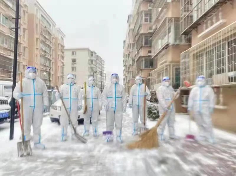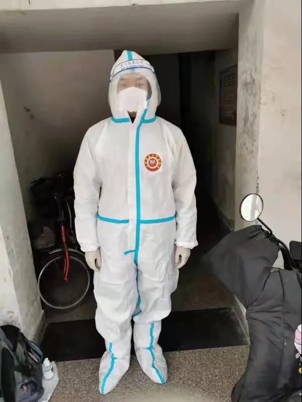 “现在这里的全天24小时都需要值守,我们分四个班次轮流工作。”刘强老师说,做好个人防护措施是每天开始工作前的重要任务,穿上防护服、鞋套、戴好手套、口罩、帽子和防护面罩,在脚踝、手腕处用胶带粘好,避免皮肤裸露在空气中。整套防护服需要十分钟才能穿上,本就厚重的冬衣再加上一层防护服,行走极为不便,“戴上防护面罩后,我们一哈气面罩上就起雾,看不清楚,但这是必须要戴的。”刘强说,他们主要的工作任务是值守单元楼门、劝导居民不出门、为居民送食品以及生活用品、收取居民生活垃圾等工作,此外,还要协助医护人员入户对全体居民进行核酸检测。
