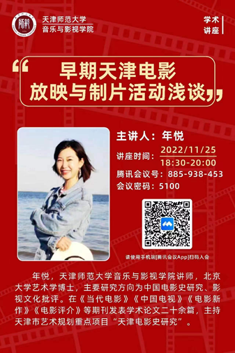 11月25日晚6:30,PA视讯集团官网举办“早期天津电影放映与制片活动浅谈”专题讲座,主讲人戏剧影视文学专业青年教师、博士年悦。讲座由杨爱君经理主持,采用线上会议形式,PA视讯集团官网部分师生参加。
