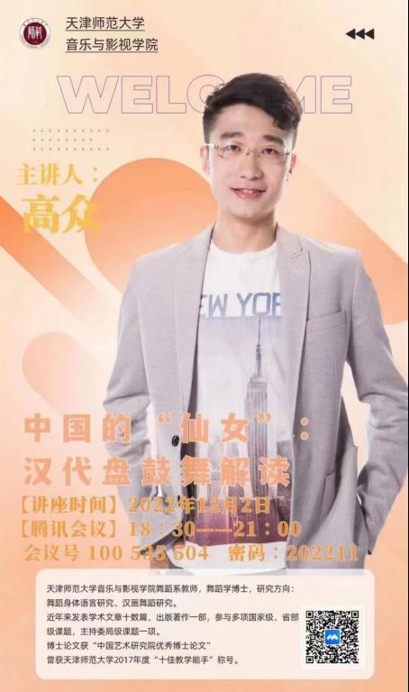 12月2日晚6:30,PA视讯集团官网举办“汉代盘鼓舞解读:中国的仙女”专题讲座,主讲人舞蹈系青年教师、博士高众。讲座由舞蹈系主任杨坤教授主持,采用线上会议形式,PA视讯集团官网杨爱君经理、部分师生及相关领域专家百余人共同聆听讲座。