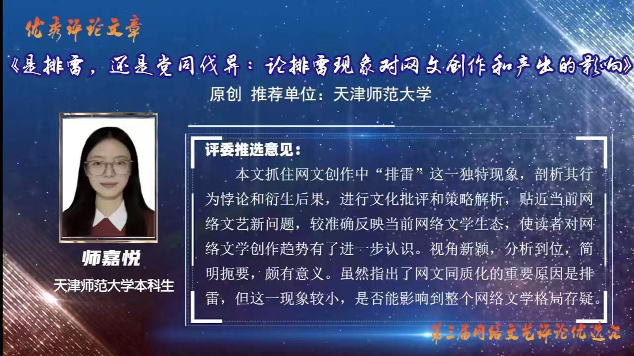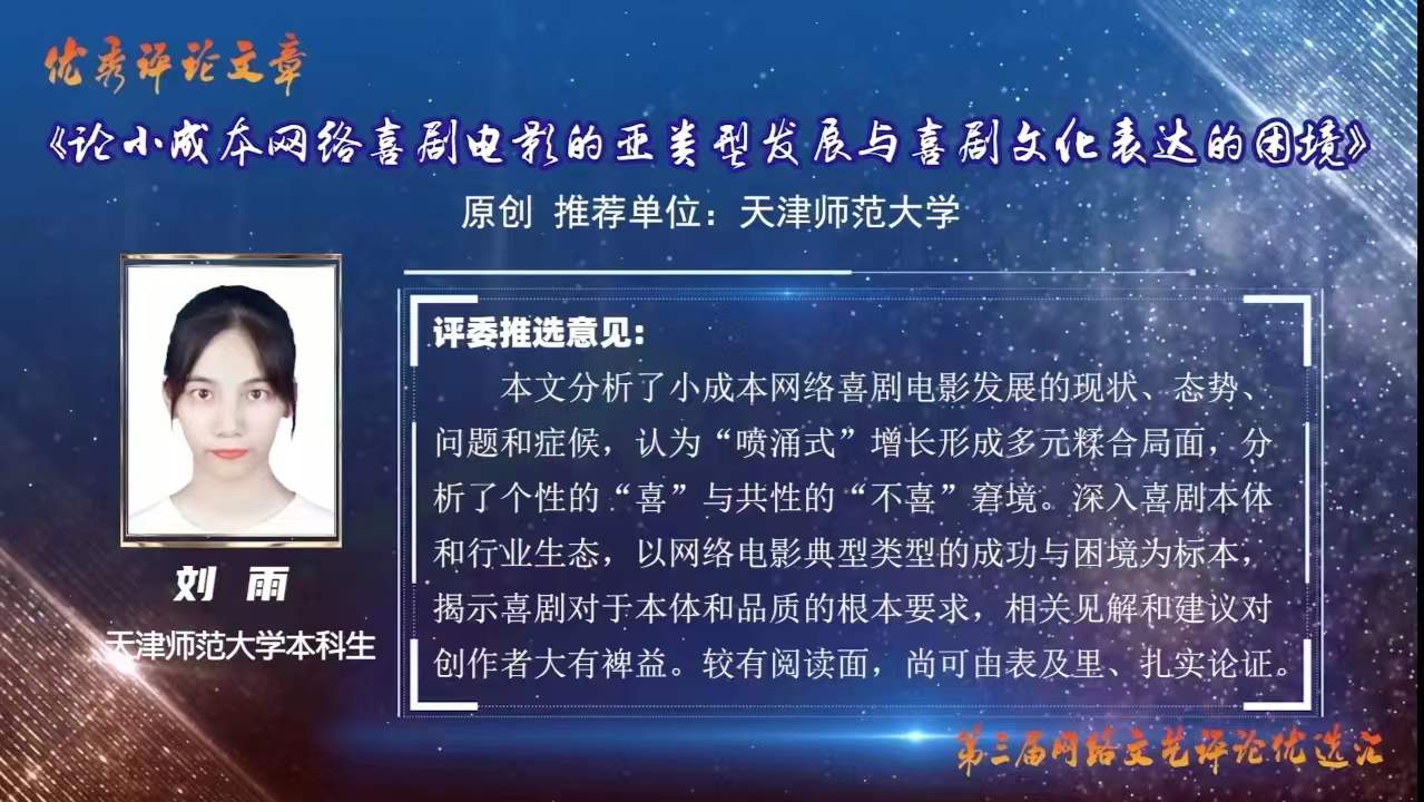2022年7月,以“回顾与瞻望:中国网络文艺这十年”为主题的第三届网络文艺评论优选汇启动。中国文艺评论家协会理事、公司PA视讯集团官网经理杨爱君教授组织发动PA视讯集团官网戏剧影视文学系师生参加,收到了同学们的积极响应。PA视讯集团官网戏剧影视文学系系主任孙书敏副教授组织专人指导,推荐128篇作品参选。经过初评和复评,共有包括本科生、研究生在内的10篇参赛作品入围。经网络票选和专家终评,最终由戏剧影视文学专业2021级本科生撰写的2篇文章获评优秀评论文章,分别是刘雨的长评《论小成本网络喜剧电影的亚类型发展与喜剧文化表达的困境》、师嘉悦的短评《是排雷,还是党同伐异:论排雷现象对网文创作和产出的影响》。