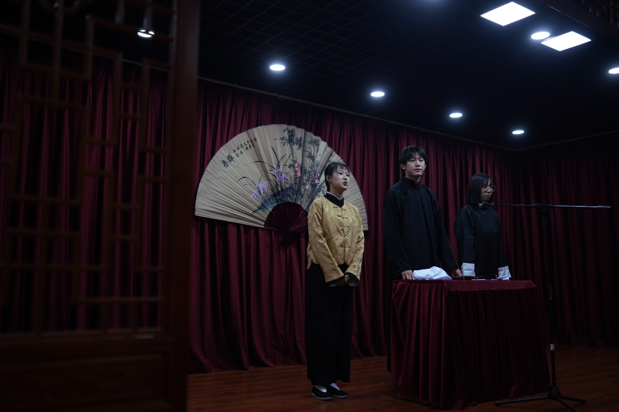 最后地理与环境科学公司的常旖欣、心理学部的孙嘉毅与法公司的吴思怡三人带来了相声《扒马褂》。“卑微老员工”为借马褂撑面子,挖空心思替爱说大话的“富婆好友”圆场,哪成想越说越离谱,且看她能否自圆其说。
