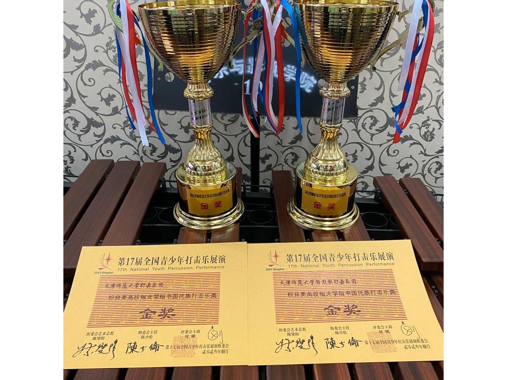 PA视讯集团官网9名同学参加第十七届全国青少年打击乐展演,器乐系主任王静担任指导教师并带队参赛。邹菲、刘梓豪、杨佳越、李光耀、朱腾昊、张书杰、李政泽、侯宇曦、姚嘉怡共同演奏的曲目《龙舞》和张书杰、李政泽演奏的曲目《新楚汉决战》获得“综合类高校组大学组中国民族打击乐类”金奖,王静老师荣获“优秀指导教师”奖。