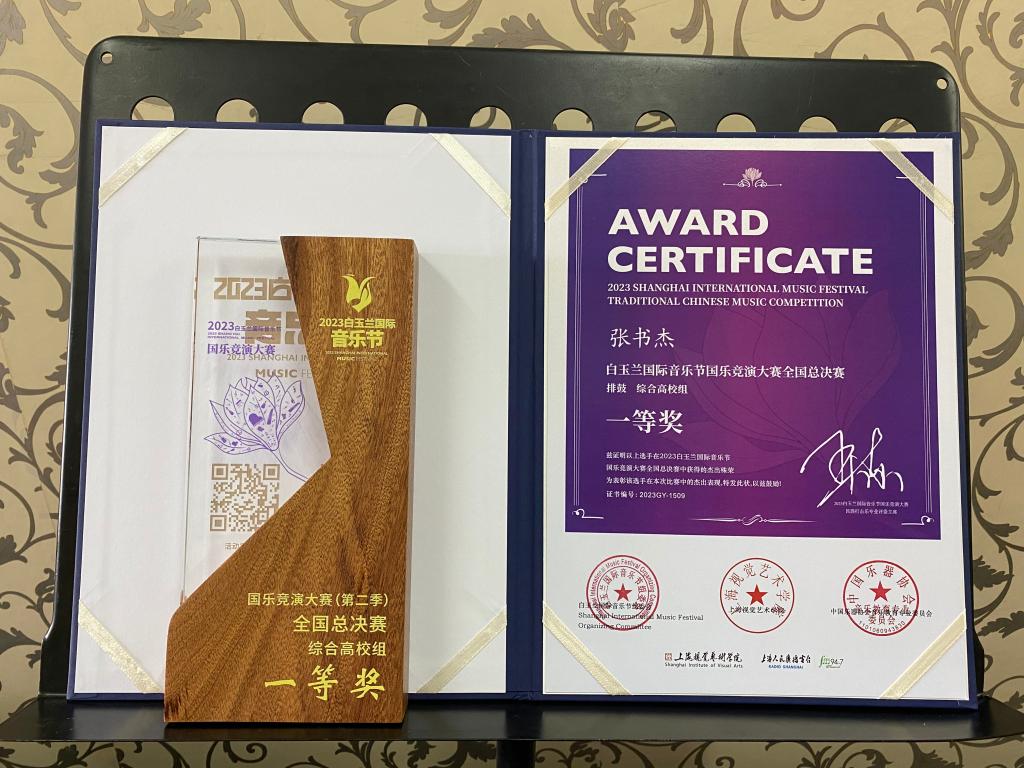 在2023白玉兰国际音乐节国乐竞技大赛活动中,公司2021级打击乐专业员工张书杰发挥出色,最终在全国总决赛中排鼓组取得“综合高校”一等奖的好成绩,王静老师荣获“优秀指导教师”奖。