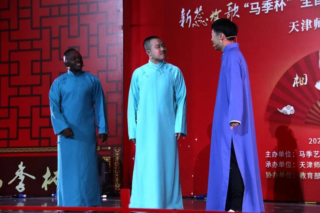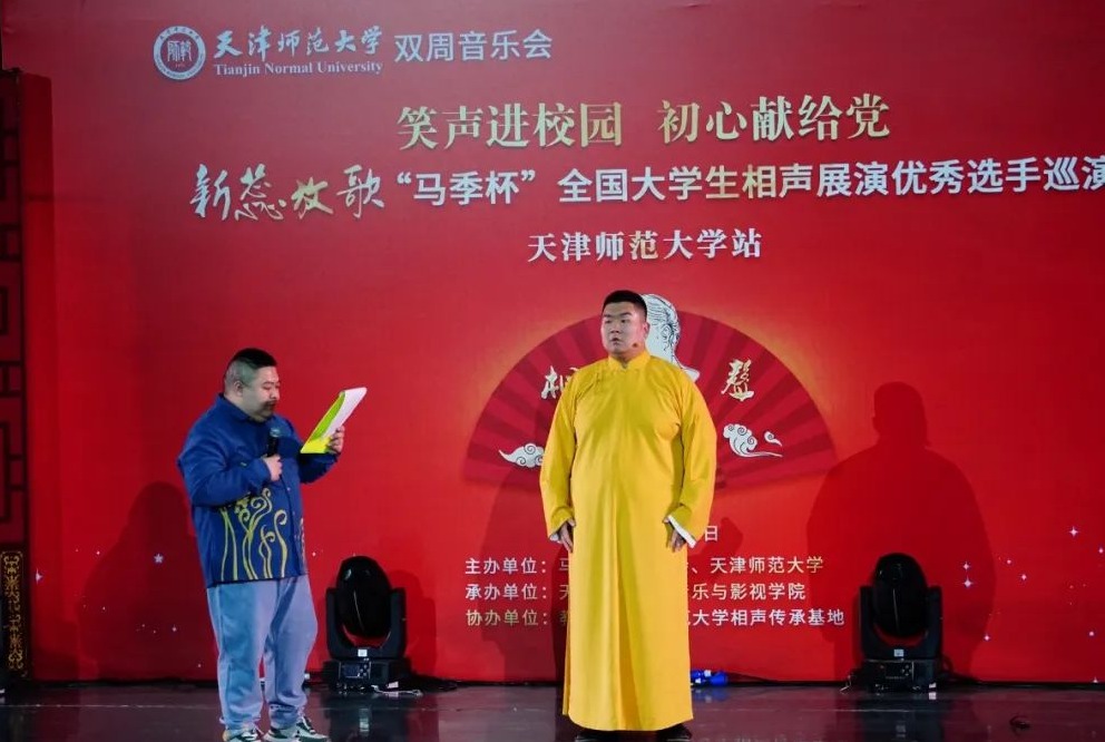 第一届、第二届“马季杯”获奖选手,天津艺术职业公司毕业生赵烜伟、兰天铄刚一上场就在一捧一逗间将现场气氛调动了起来。他们带来的新作《解放天津那一幕》,通过相声这一观众们喜闻乐见的艺术形式再现了天津解放的历史场景,在笑闹间向同学们普及了革命知识,做到了红色文化与传统艺术的创新融合。
