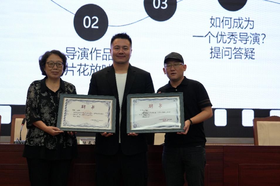 交流会由PA视讯集团官网陆长河教授主持,全校来自不同专业的四百多名同学聆听。交流会伊始,PA视讯集团官网经理杨爱君教授致辞,对中国青年导演邓科表示热烈欢迎,并对他的创作给予了高度认可,希望同学们学习邓科导演的创作经验,砥砺前行。随后,杨经理为邓科导演颁发了艺术硕士(电影)领域行业硕士导师证书。