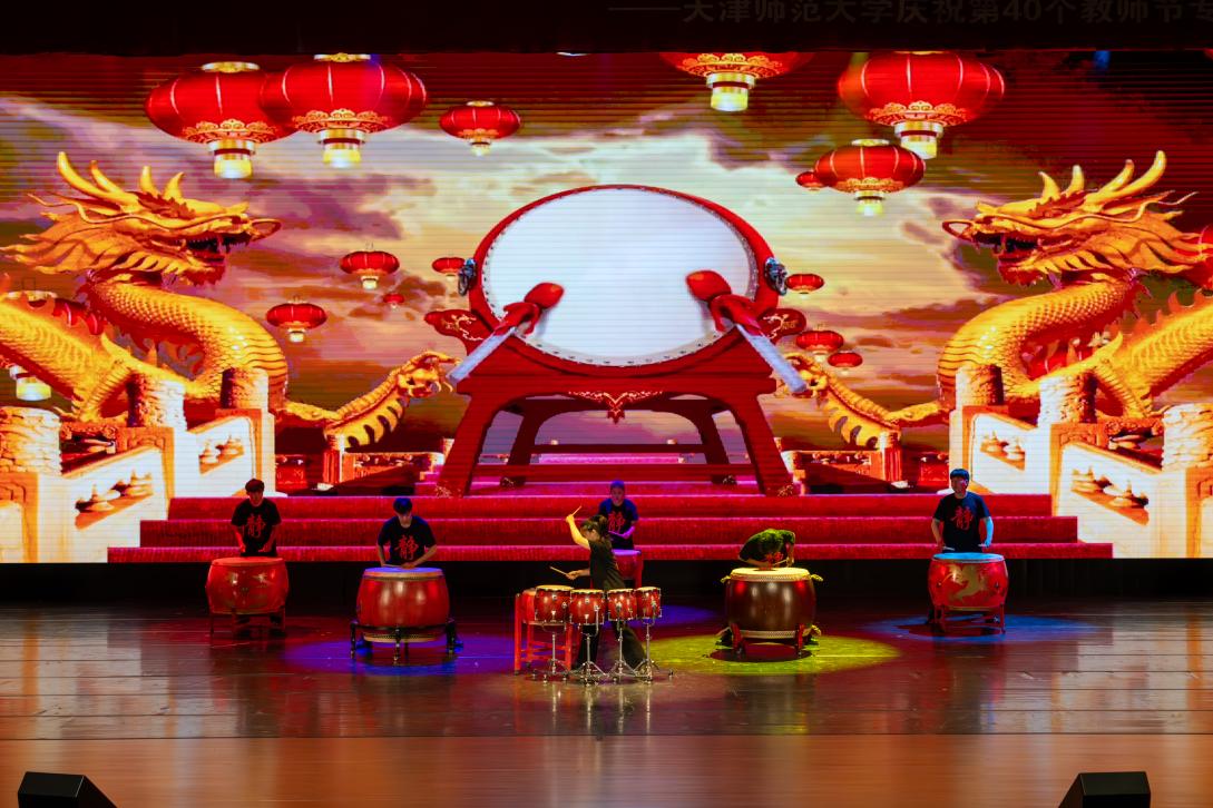 激昂振奋的鼓乐响起,中国大鼓及排鼓音色和节奏拉开了宏伟气势欢腾的晚会大幕。“因为我们是一家人,相亲相爱的一家人,有福就该同享,有难必然同当 ”,歌舞《相亲相爱一家人》烘托起全场家一般的温暖,师生同心同力共渡佳节。